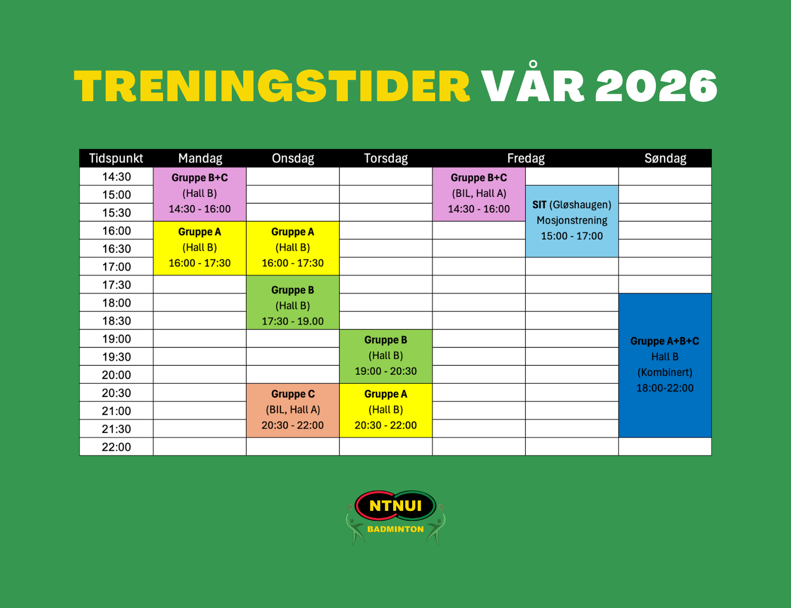 Treningene foregår på Dragvoll- og Gløshaugen idrettsbygg, og vi har treninger for alle nivåer.