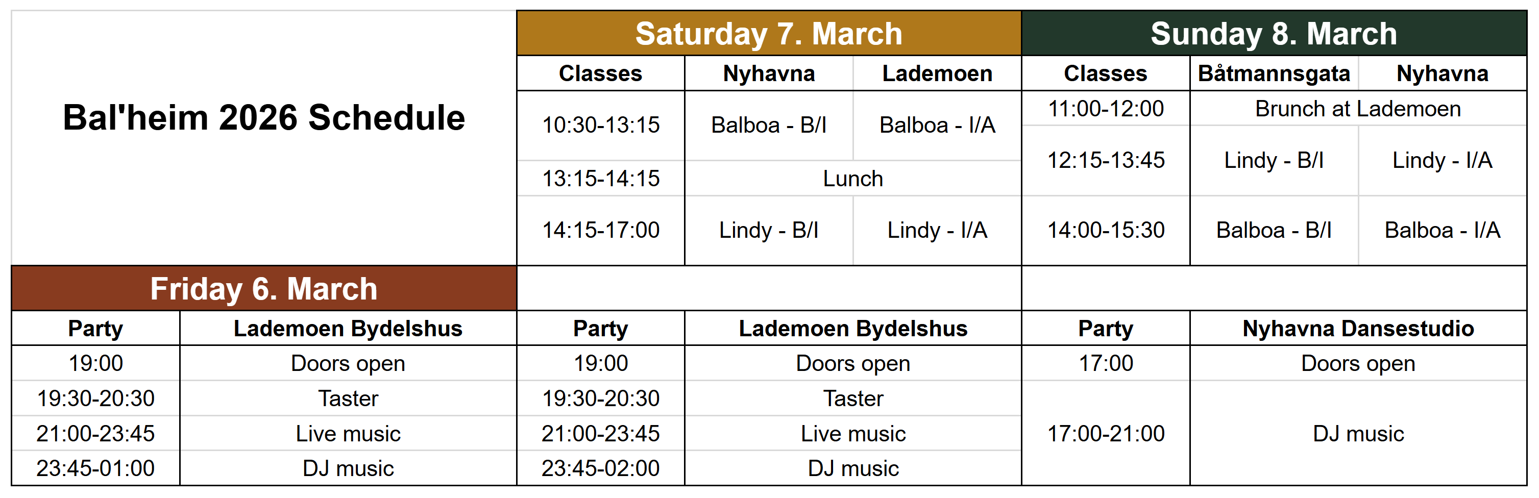 Classes and parties will take place in two separate venues. Check out our interactive map for more information on the venues and the surrounding area.