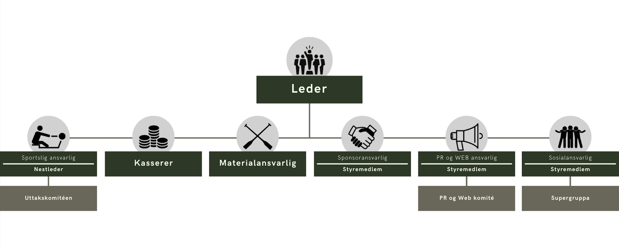 Styret leder NTNUI Roings virksomhet og skal ha følgende sammensetning, der hvert av medlemmene binder seg i utgangspunktet for ett år. Styret har i utgangspunktet møteplikt på̊ alle styremøter. 3 av de ordinære medlemmene i styret må̊ være tilstede før beslutninger som har innvirkning på̊ gruppens økonomi, kan fattes. Ved avstemninger som ender likt vil leders stemme telle som en dobbeltstemme.