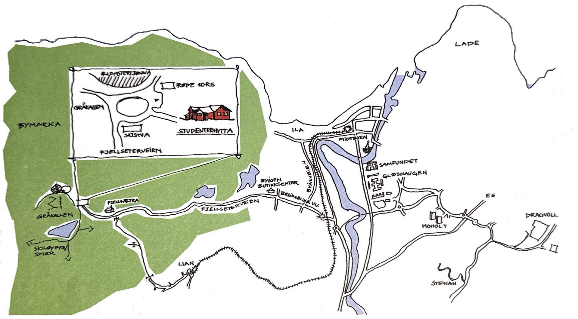 Til fots: Både sommer og vinter kan du gå til fots til Hytta. Naturlige utgangspunkt er Lian (trikk) eller Ferista/Byåsen butikksenter (buss). Fra Lian er det ca 4 km på turvei og skiløyper mot Hytta, og fra Ferista er det 5-6 km på skiløype (med lysløype) og turstier. Når du kommer opp på Fjellsetermyrene kan du se Hytta på langt hold oppe på kanten av Lille Gråkallen.