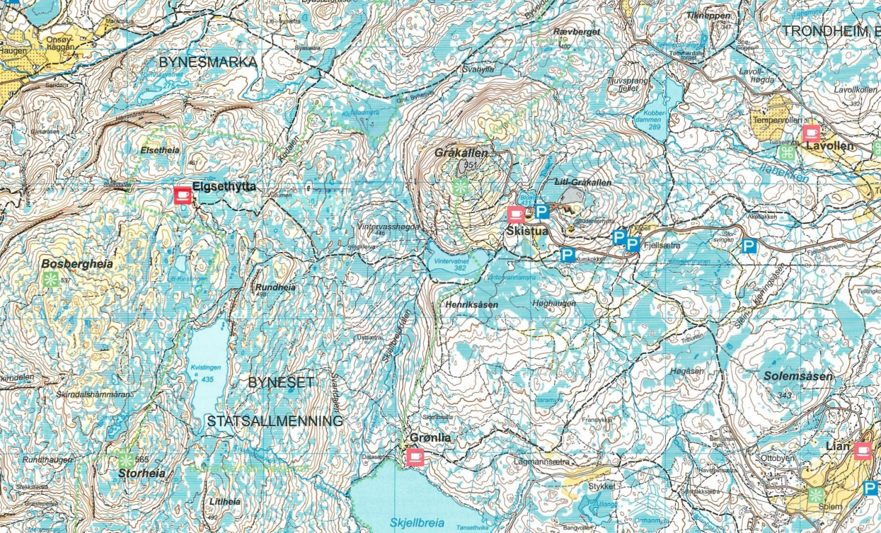 Utsnitt fra “Turkart Bymarka Sommer”, utgitt av Sp. Kl Freidig og NTNUI.